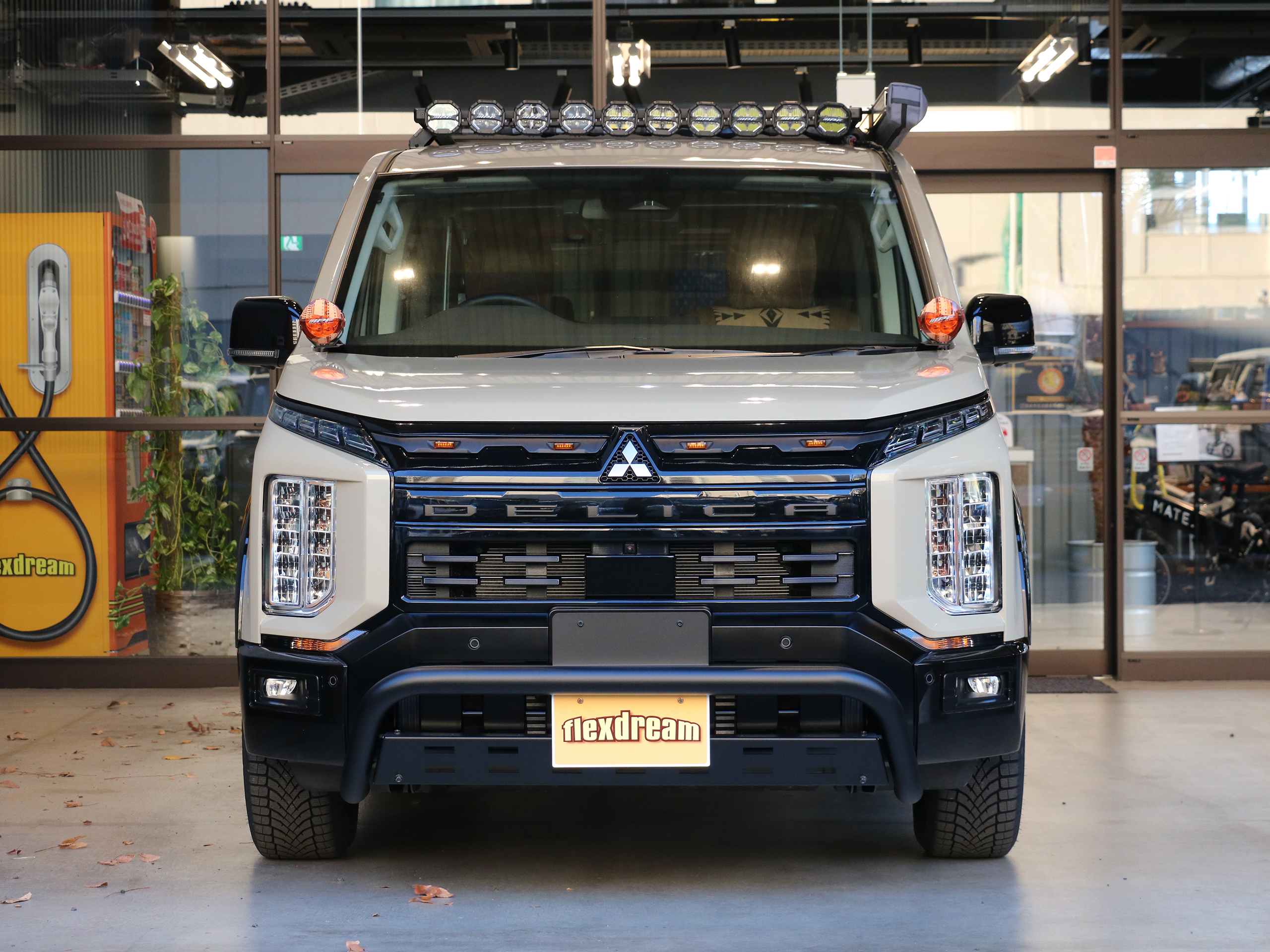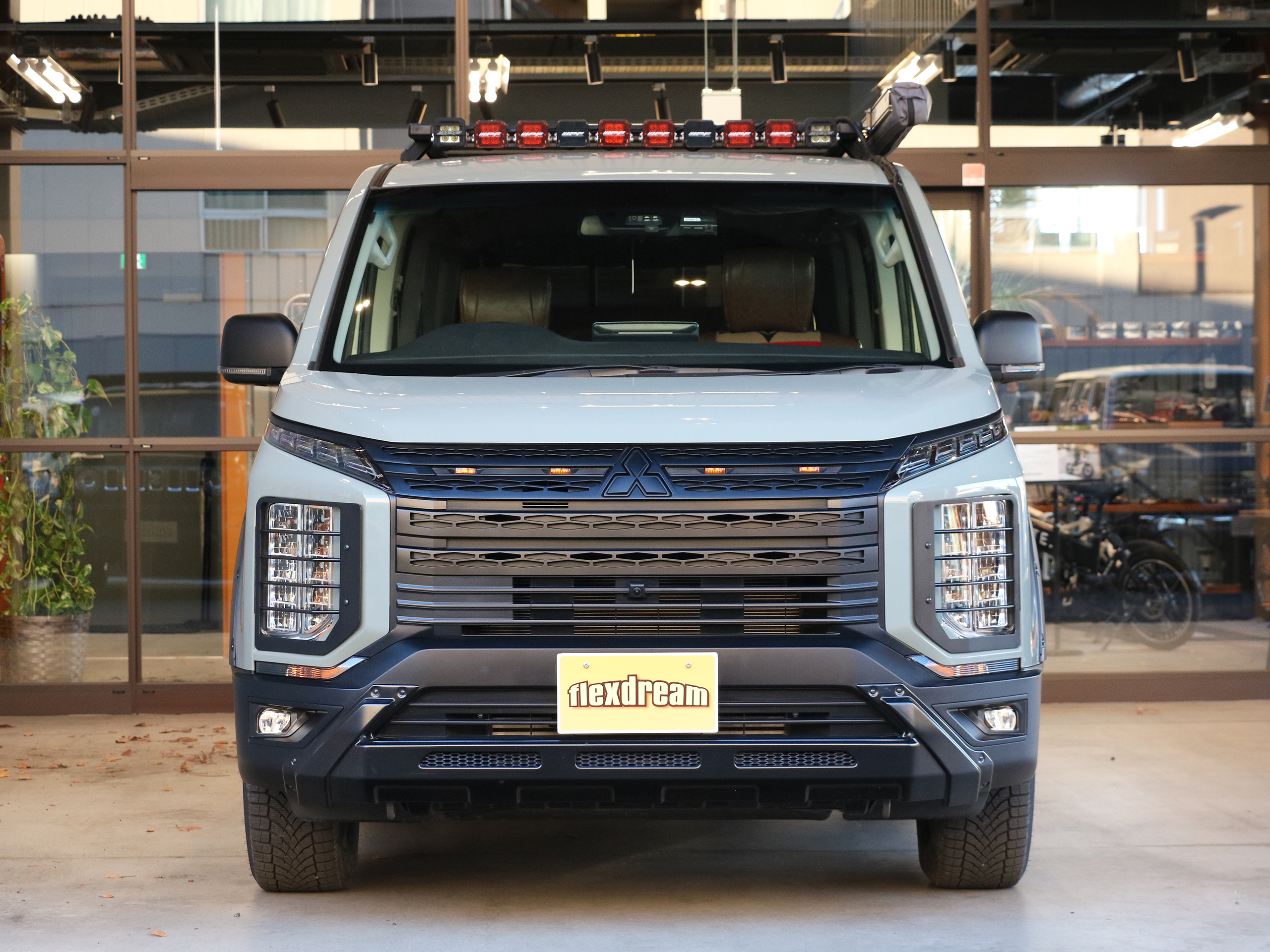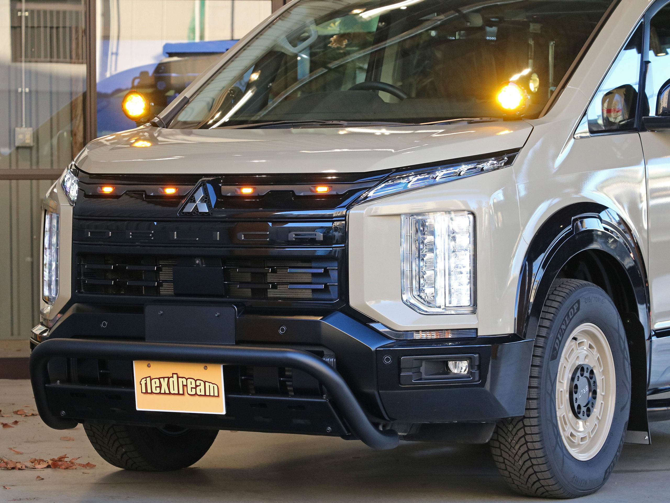 新型デリカD:5 ベージュ カスタム flexdreamフロントブッシュバー IPFルーフラック+LEDライト