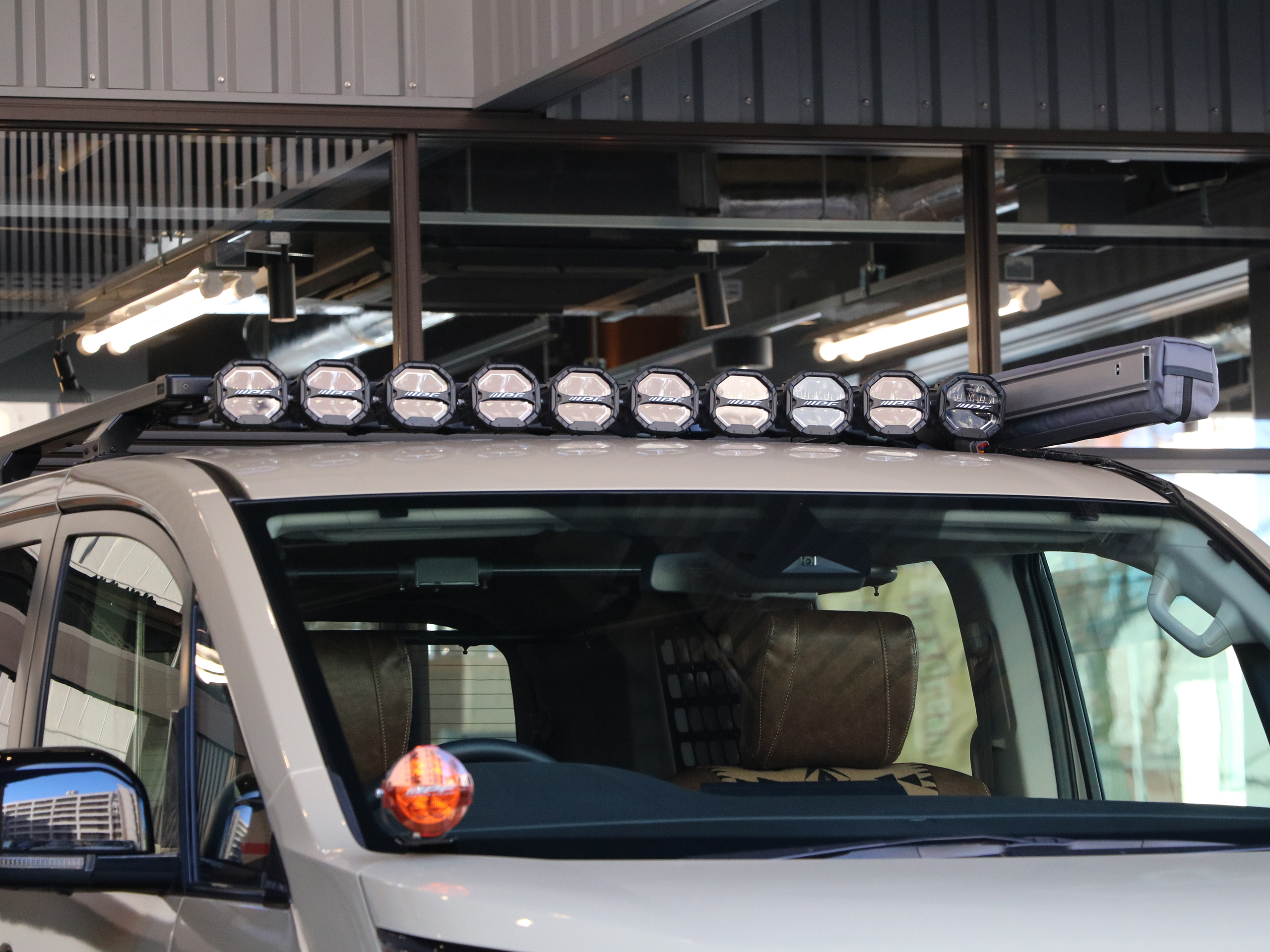 正面の画像がこちら。IPF ルーフラックの10連フォグランプはスクエア(正方形)モデルです。