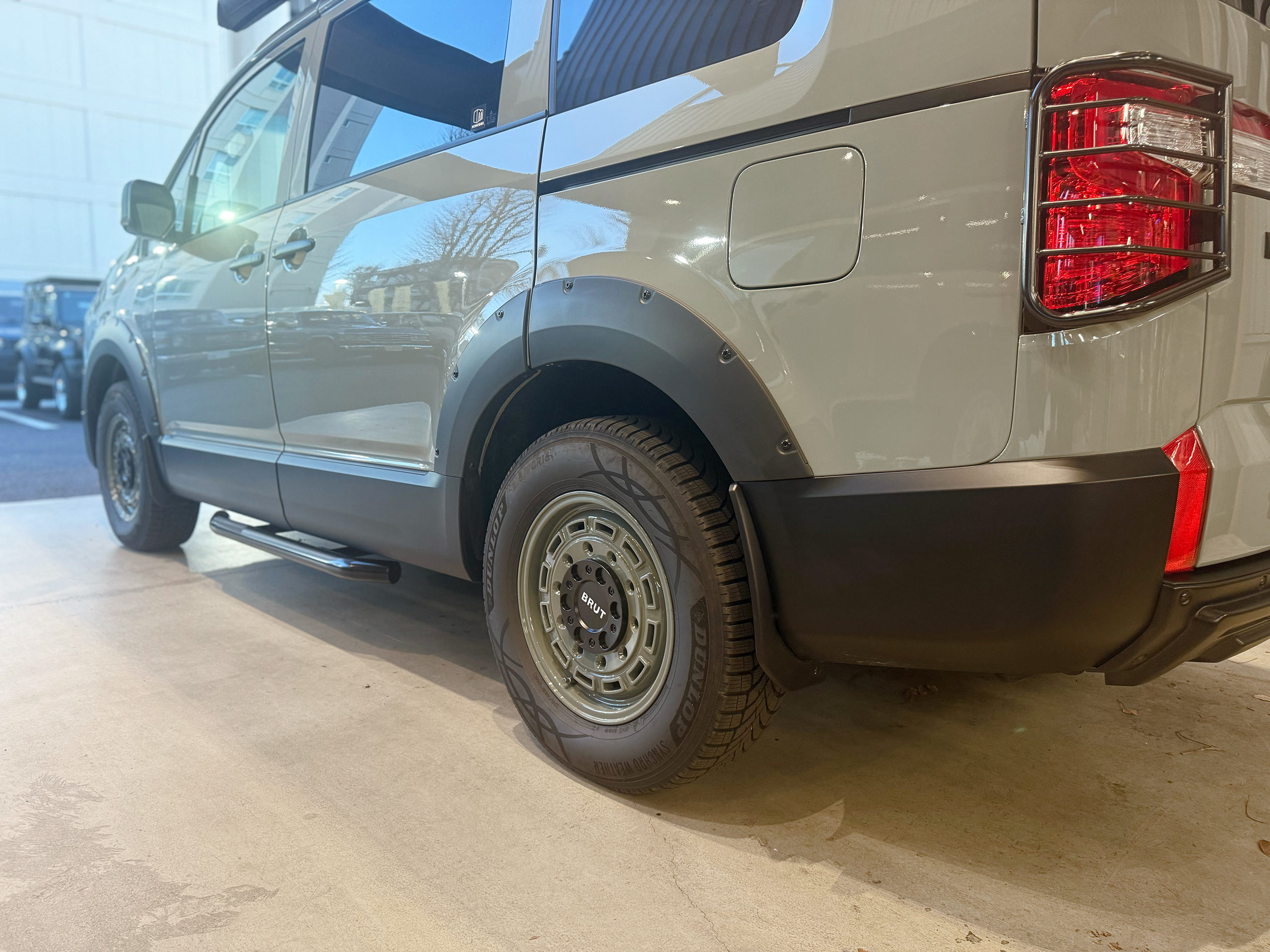 アルミホイールと同じブランド:BRUTのマッドフラップ(新型用プロトモデル)を装備。