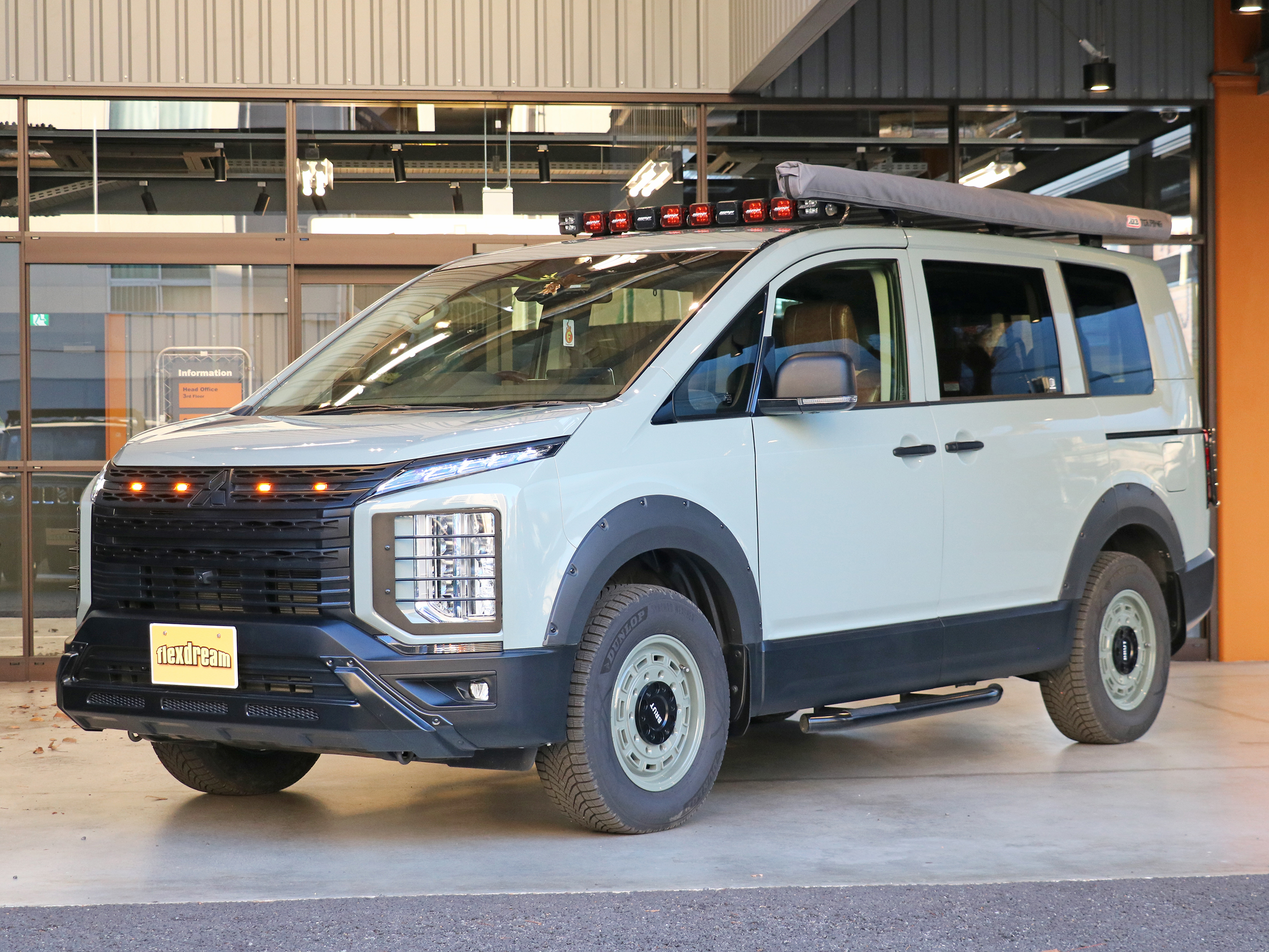 旧モデルデリカD:5 ベースの flexdreamカスタムデモカー(アーバンカーキ)。
